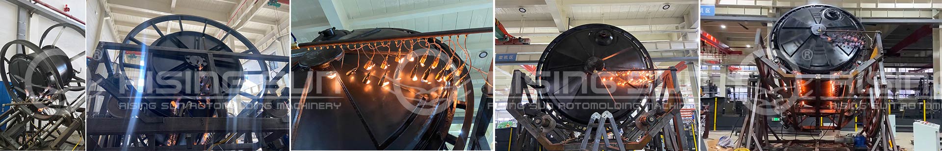 La máquina de rotación con brazo en U y llama abierta se utiliza principalmente para la producción de contenedores rotomoldeados y ocupa un espacio reducido.